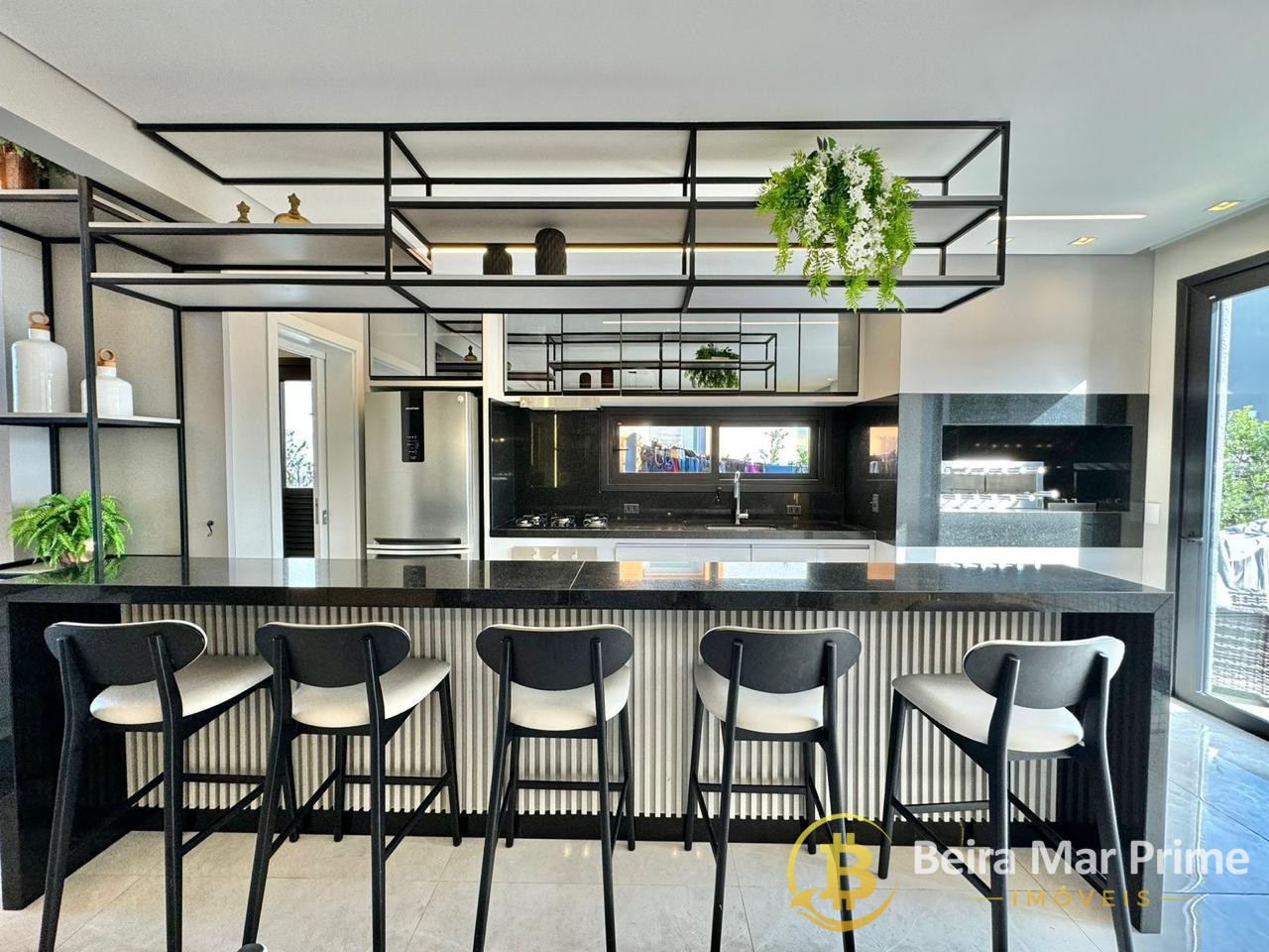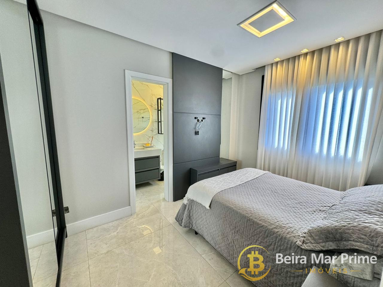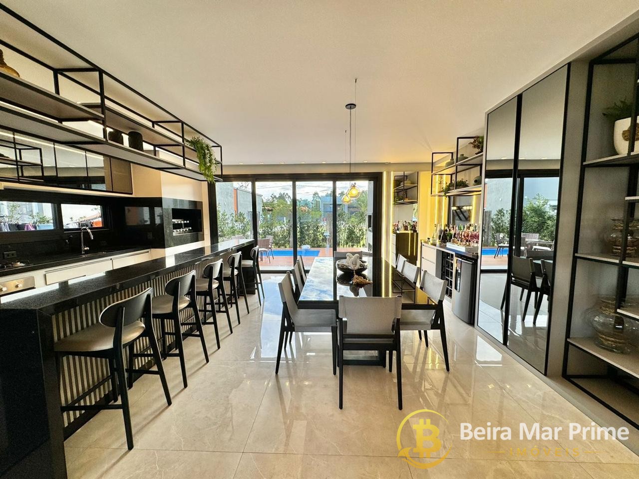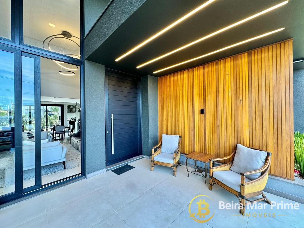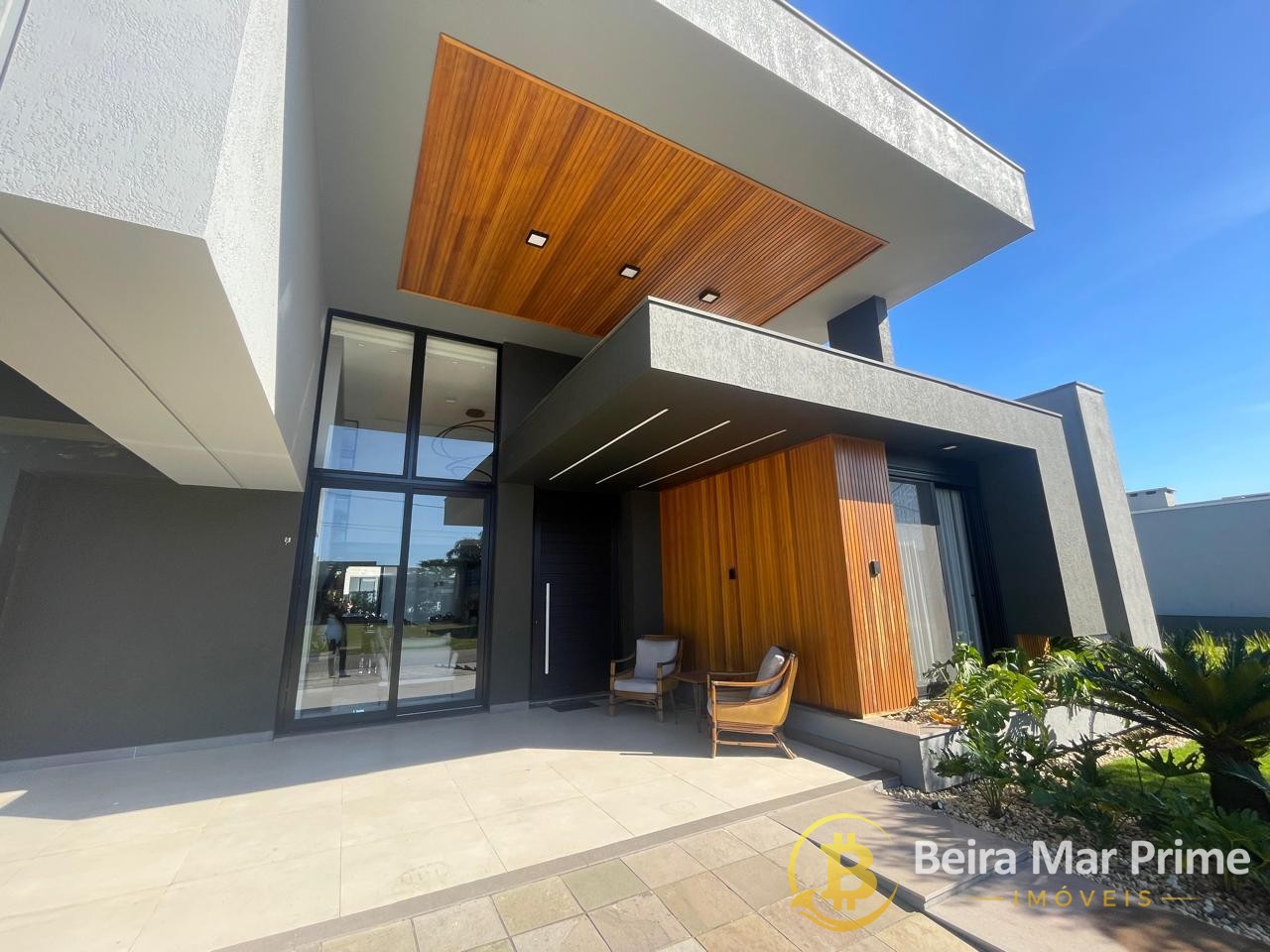 Possui ainda persianas automatizadas, aberturas em PVC preto, piso porcelanato polido 1x1, azulejos retificados e rebaixamento total em gesso. A fachada com ripado em grápia traz modernidade e personalidade ao projeto.